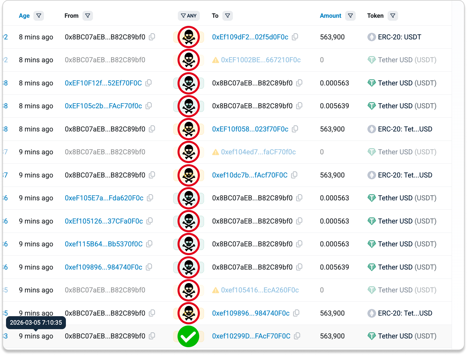 Instead of targeting only a handful of addresses, poisoning campaigns often send thousands or even millions of poison transfers. When enough attempts are made, even a tiny success rate can generate significant profits.