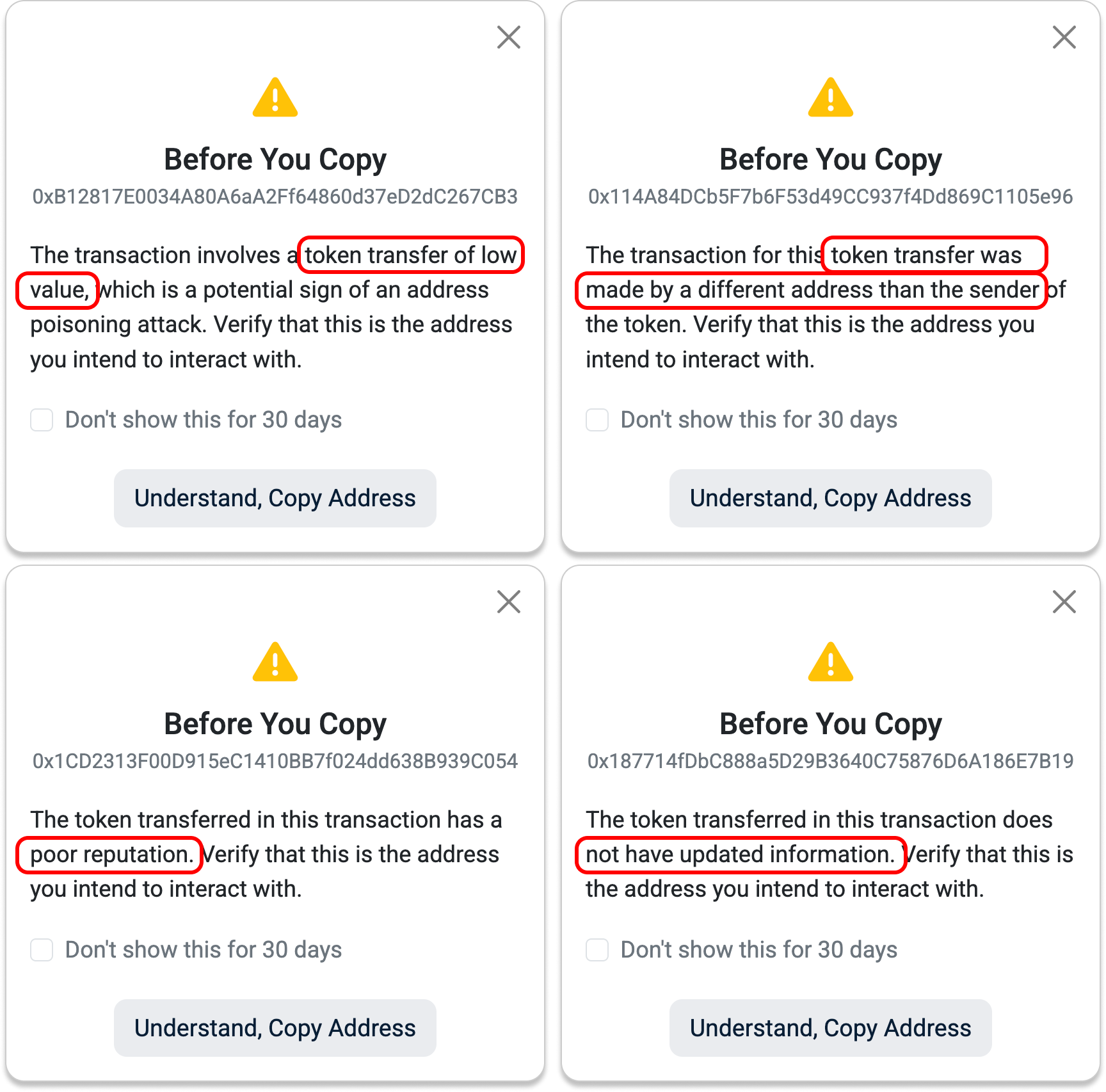 When you see these reminders, take a moment to confirm that the address you are copying is the one you truly intend to interact with.