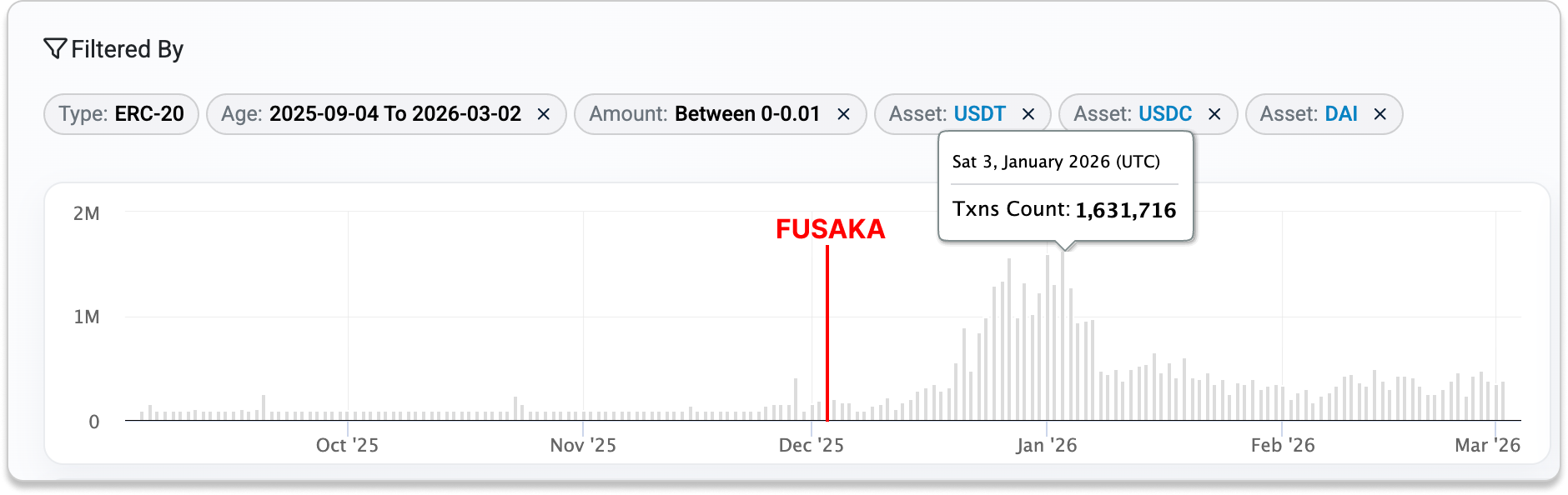 Dust transfers (below $0.01) show a clear surge shortly after the Fusaka upgrade, with activity rising sharply before gradually tapering off while still remaining at an elevated level compared to pre-Fusaka levels. In contrast, transfers above $0.01 remain relatively stable throughout the same period.