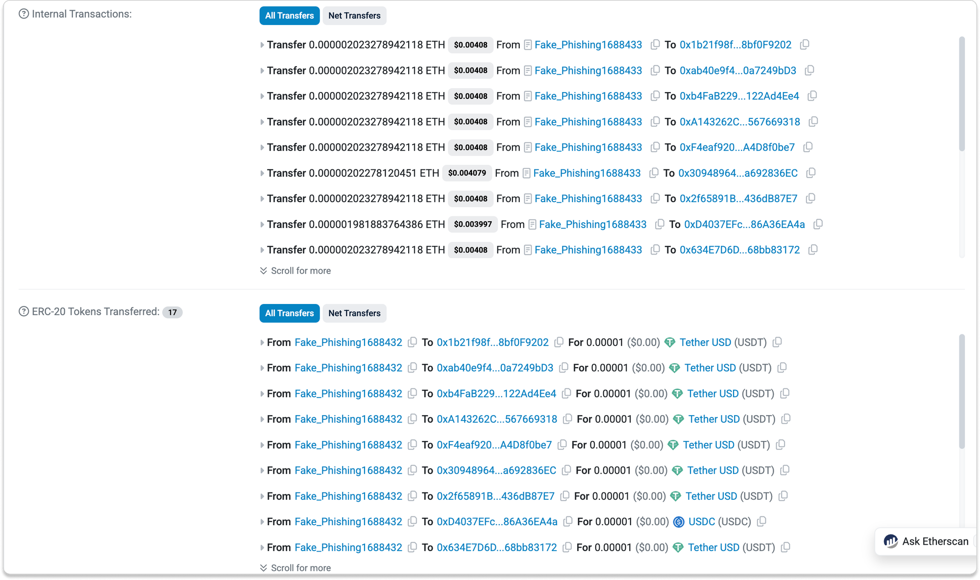 The address below demonstrates the scale of this competition. In this case, 13 poison transfers were planted within a couple minutes of a legitimate USDT transfer.
