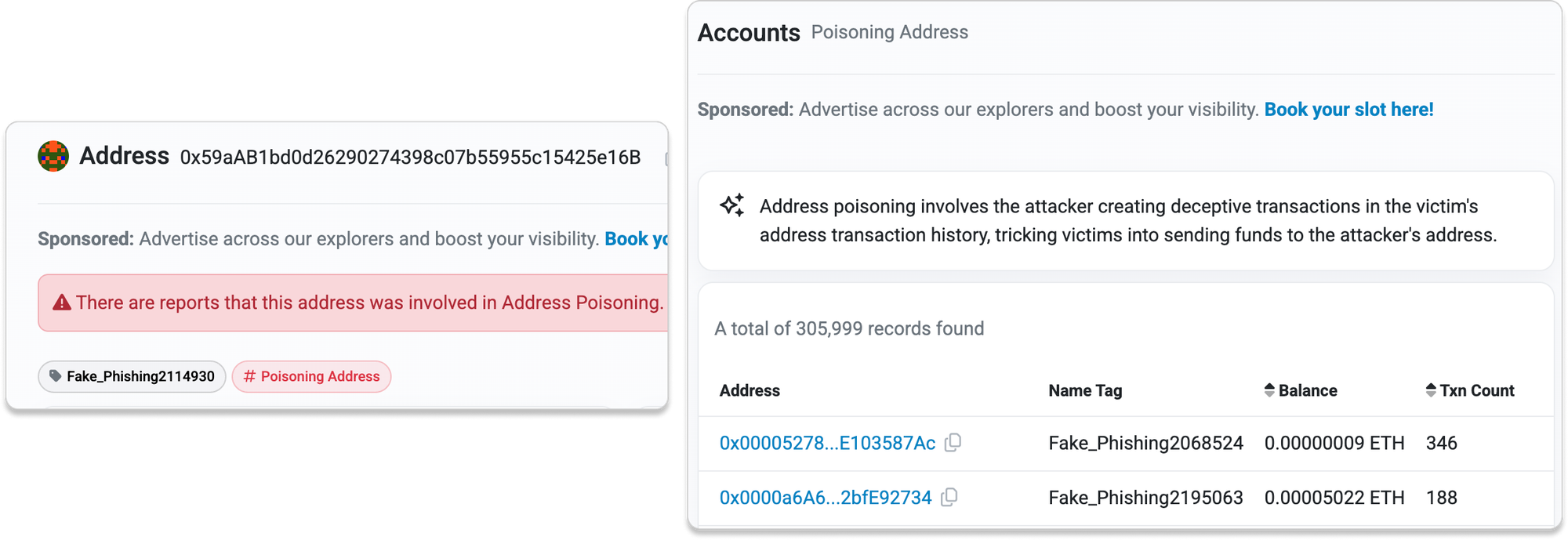 At Etherscan, we continuously improve our explorer interfaces and API services to help users detect these attacks more easily. We actively label spoofing addresses, flag and hide zero-value token transfers, and tag spoofed tokens so our curated data can surface potential address poisoning attempts without users needing to manually sift through large volumes of transactions.