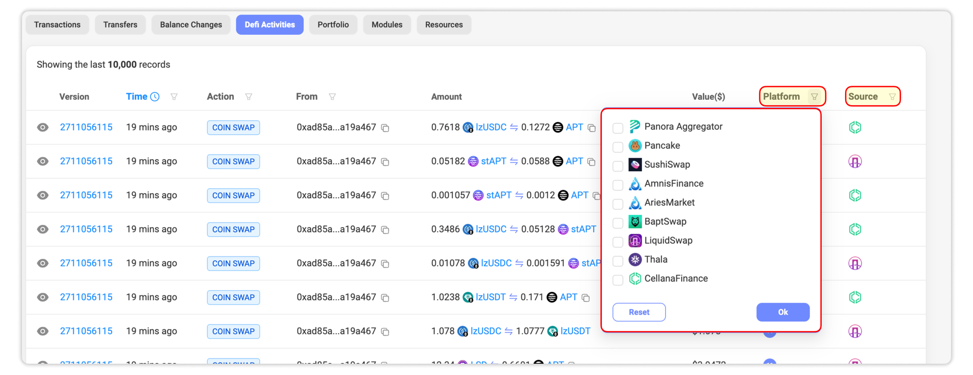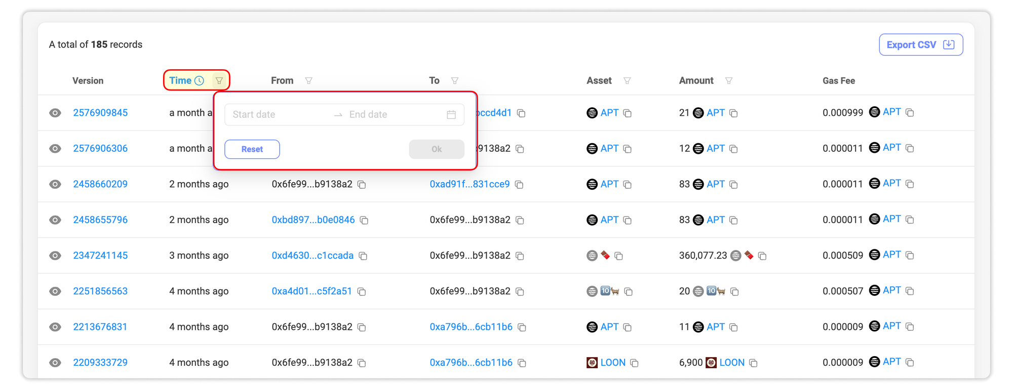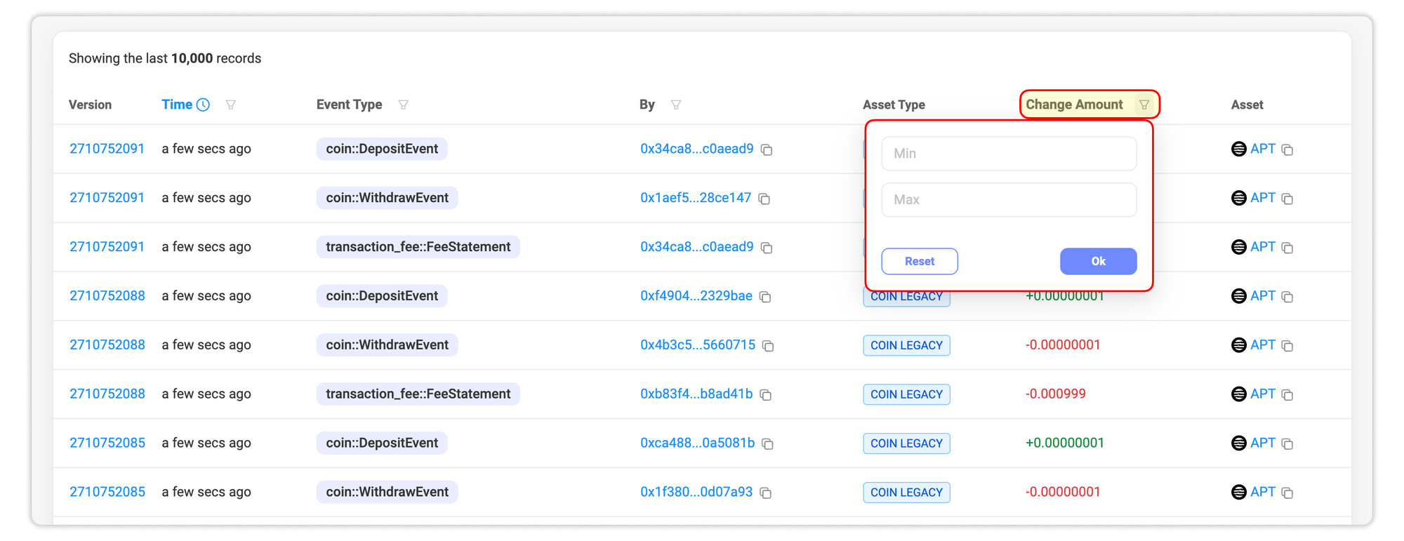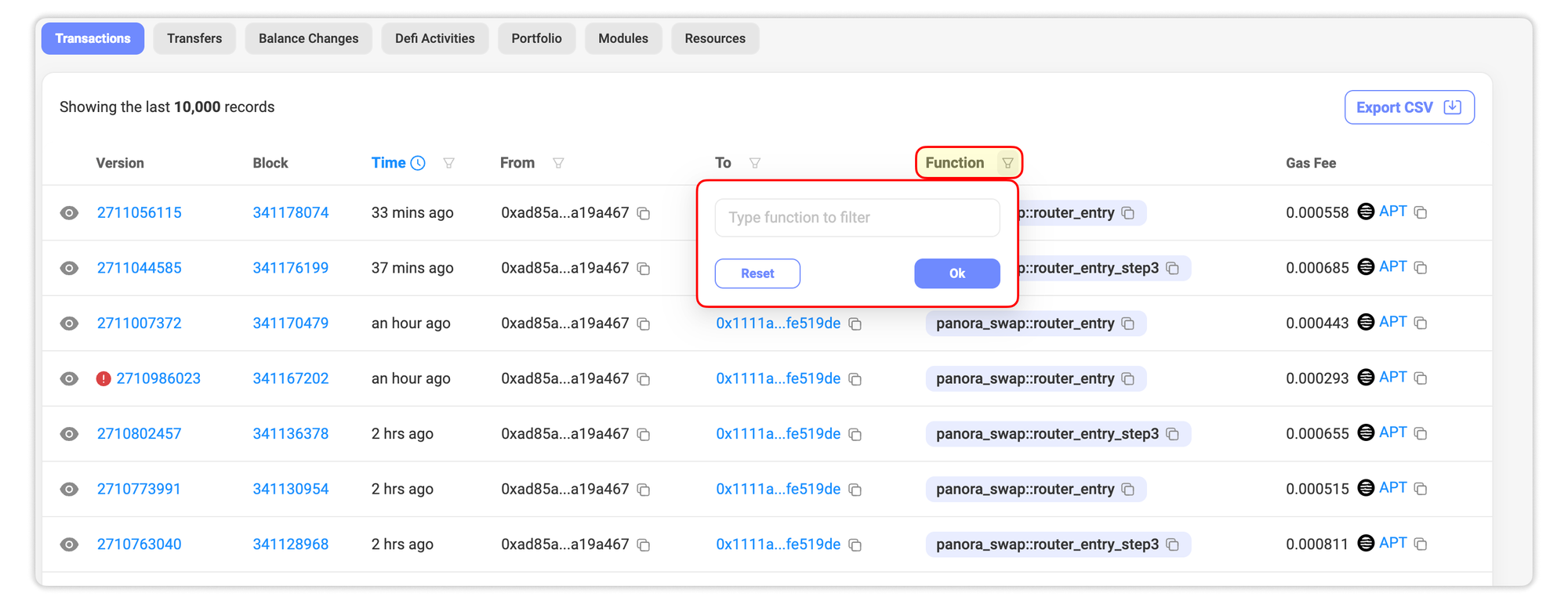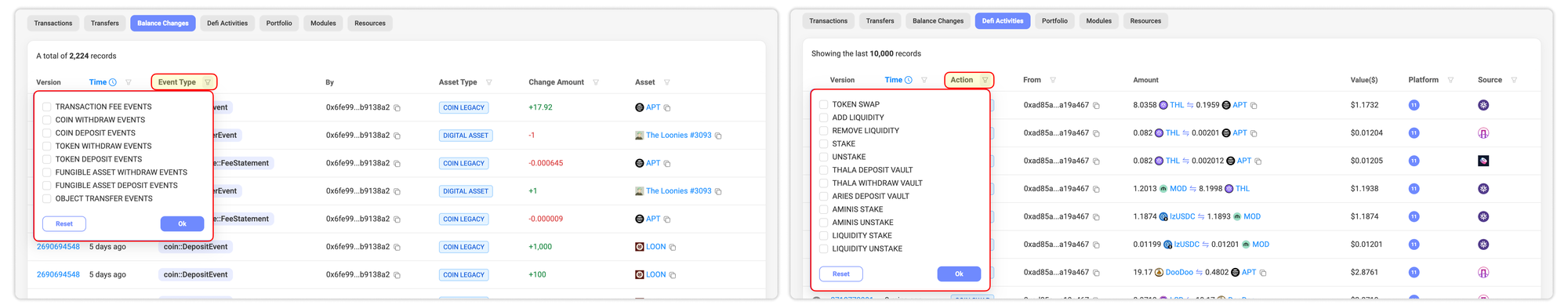 Each activity tab in Aptoscan, such as Transactions, Transfers, Balance Changes, and Coin Activities, comes with its own set of filters tailored to the type of data shown on that page. Depending on what you're viewing, the available filters may vary to help you search more effectively.
