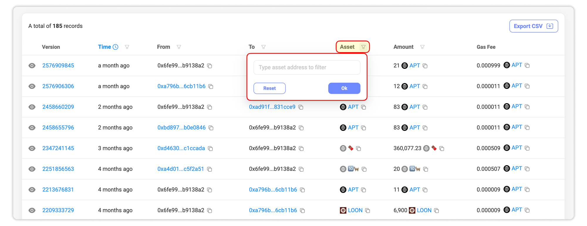 The Asset filter allows you to focus on transactions involving a specific token or coin. Simply paste the token address into the filter, and select the correct match from the list.