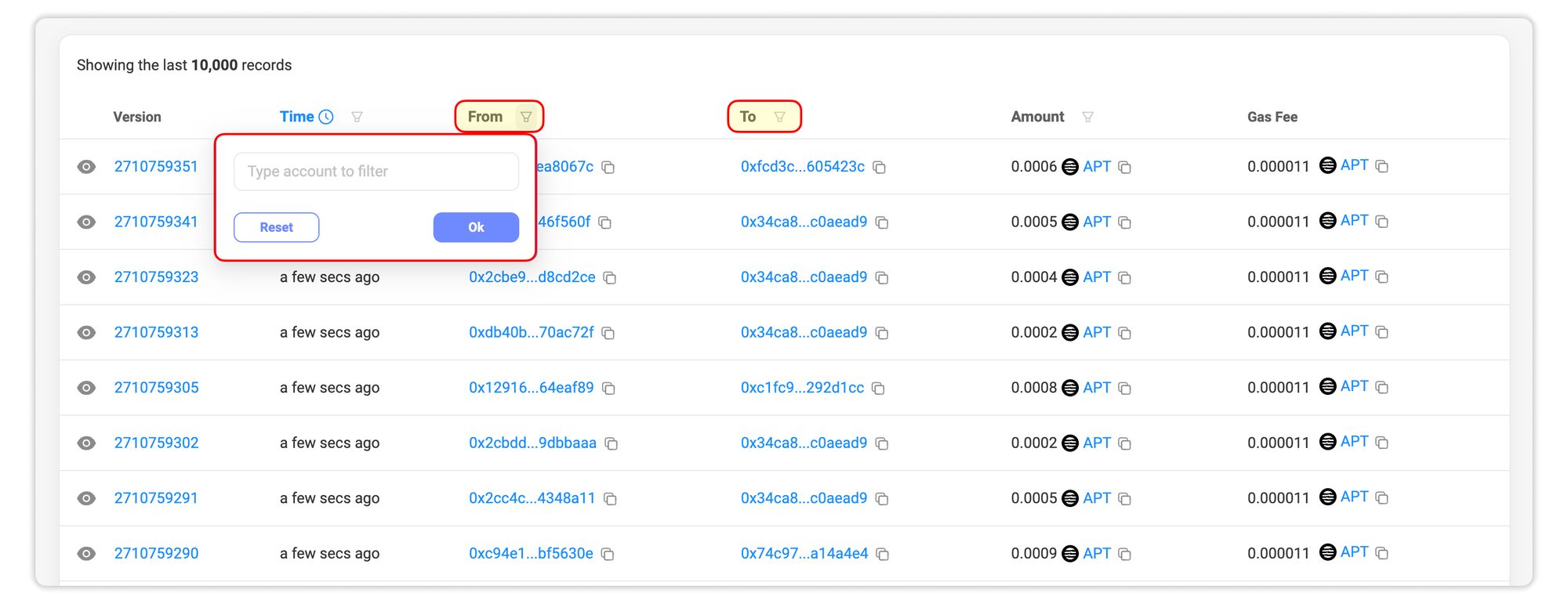Use the From and To filters to view transactions sent from or received by a specific wallet address. These filters are helpful for tracking wallet activity with precision.