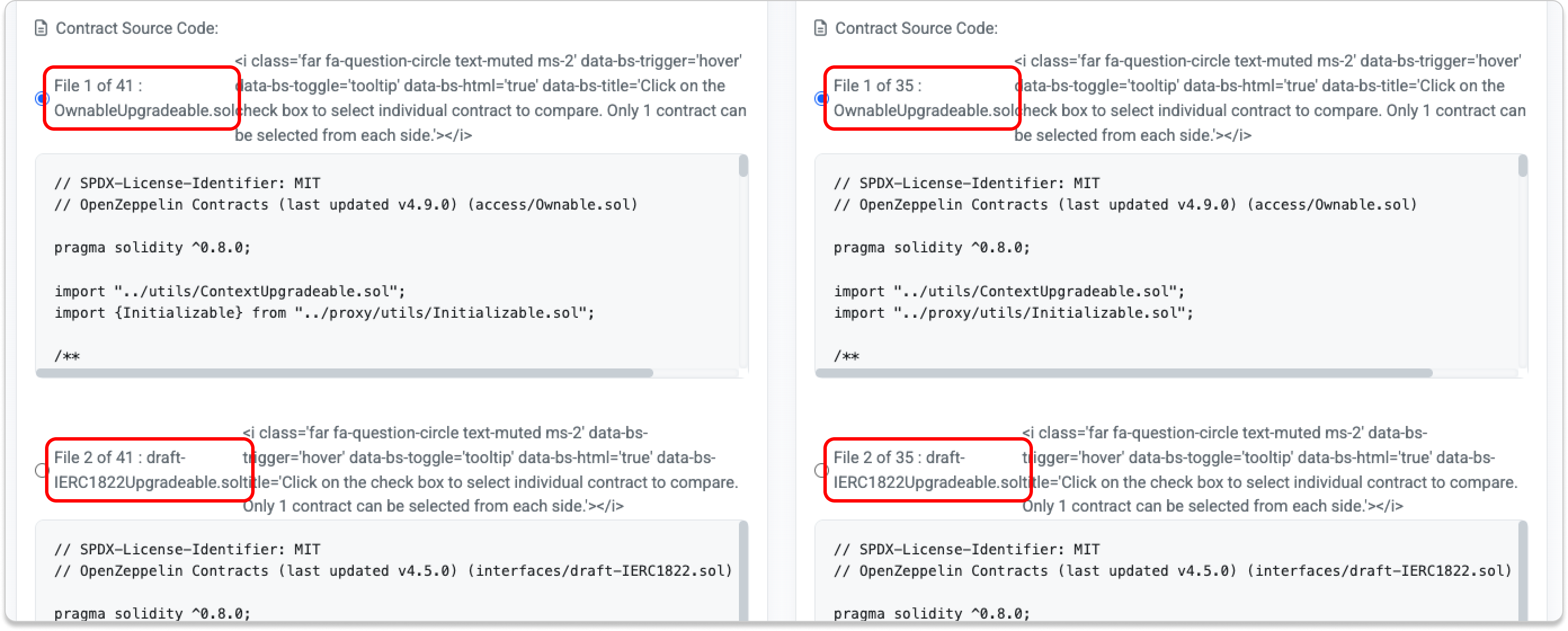 - If either contract contains multiple source files, each file will be listed with a name and number.