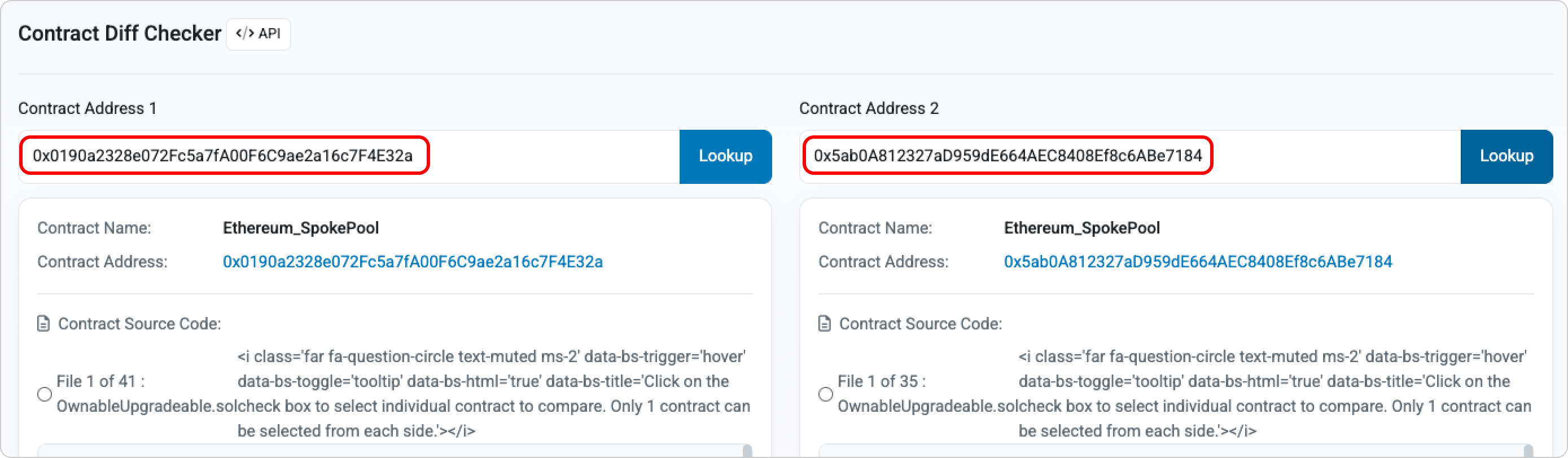 - Enter two contract addresses and click the Lookup button to load the contract details and their source code.