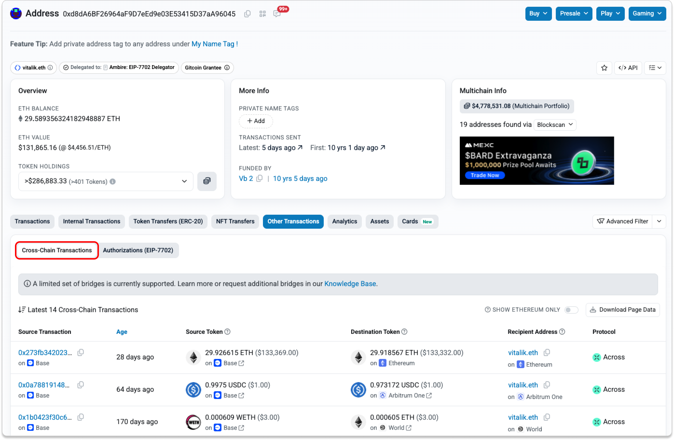Cross-Chain Transactions is available on Etherscan address pages under the Other Transactions tab. It provides visibility into an address’s activity across multiple blockchains.