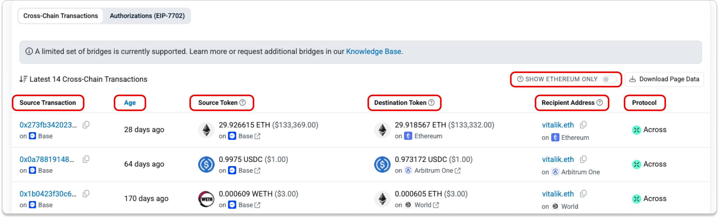 Cross-chain transactions occur when an address sends assets or interacts between different blockchains using a supported bridge. The Cross-Chain Transactions tab consolidates these activities in one place, so you can easily track an address’s movements across chains, such as monitoring stablecoin transfers.