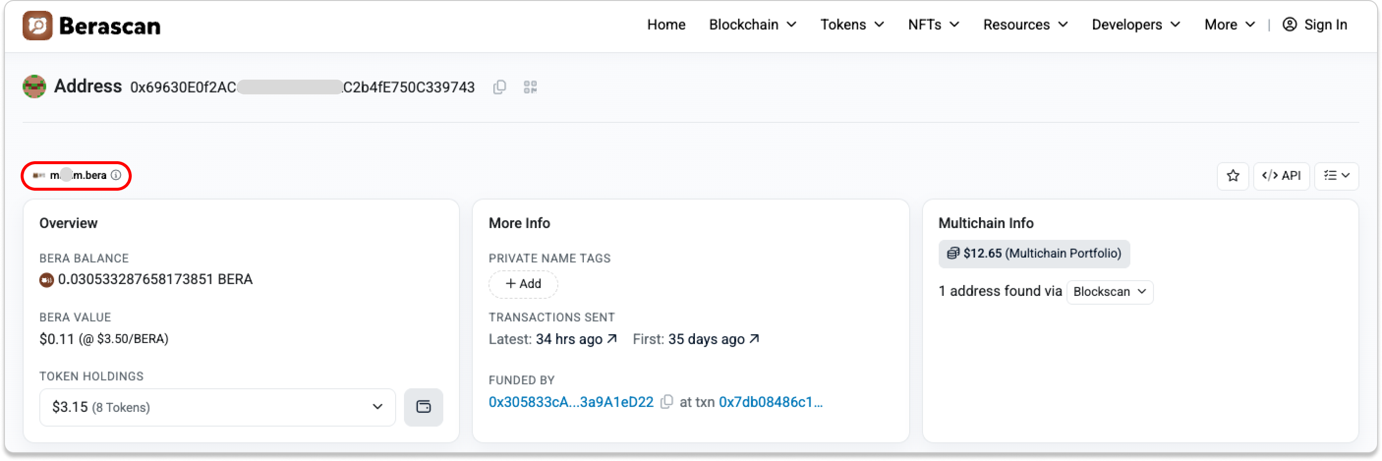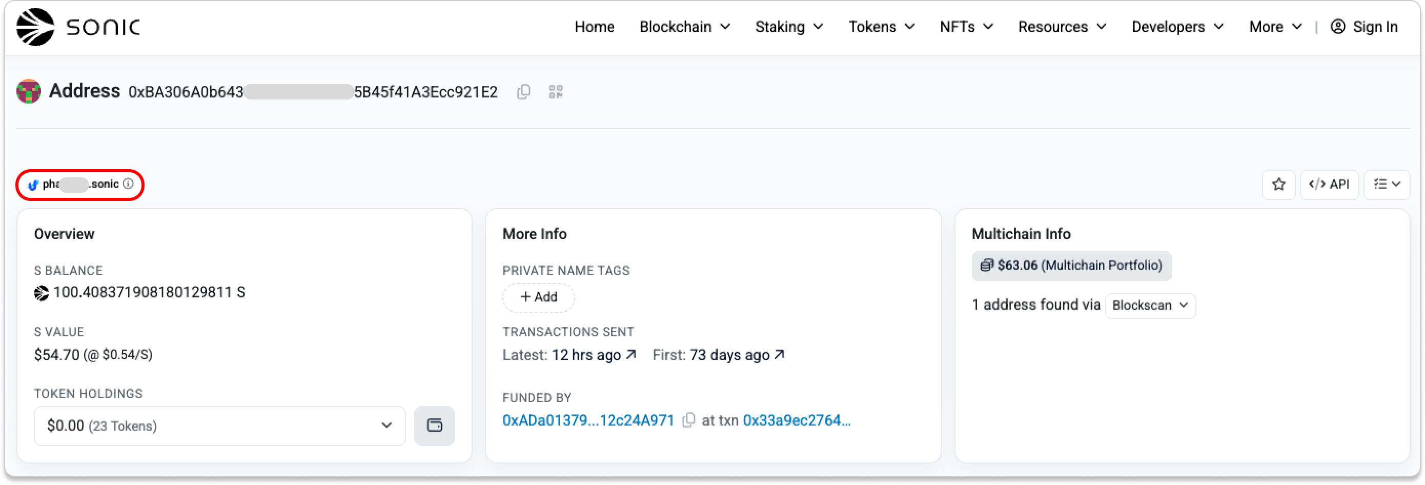 At {{explorer}}, we support {{domain}} names. They can be resolved to your {{chain}} address, and the domain name will be displayed as a name tag in the address page as shown below.