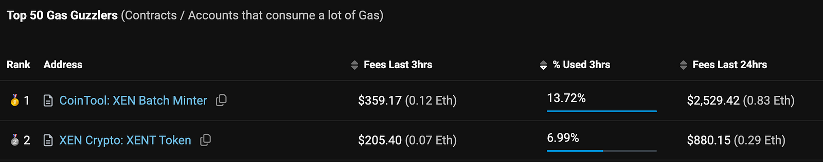 Here’s an example transaction that minted many XEN coins to a batch of wallets. It consumed 24,410,592 gas. These contracts are often high on Etherscan’s gas guzzler list: