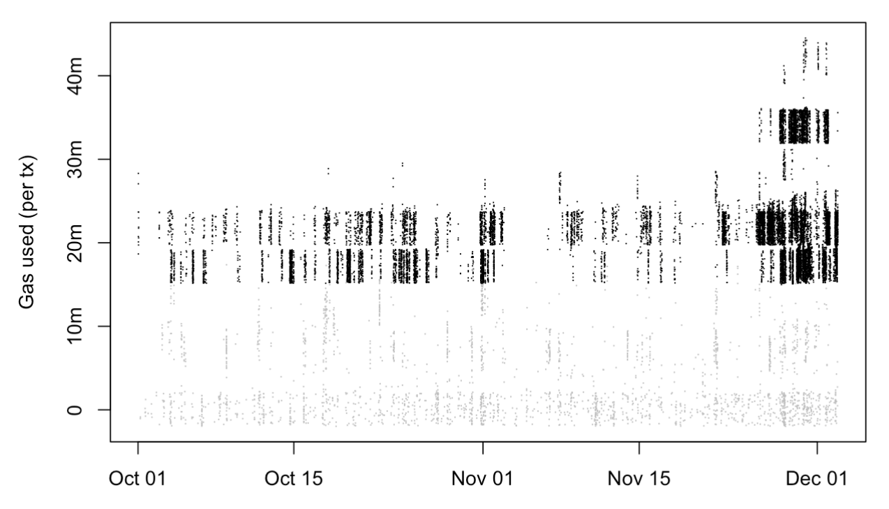 We can improve the sense of scale in the graph below. In this graph, we slightly shuffle the (x,y) placement of these dots, each a transaction. This separates transactions to see each individually. We see waves of high-gas activity collected at particular points in time, especially as Fusaka approaches.