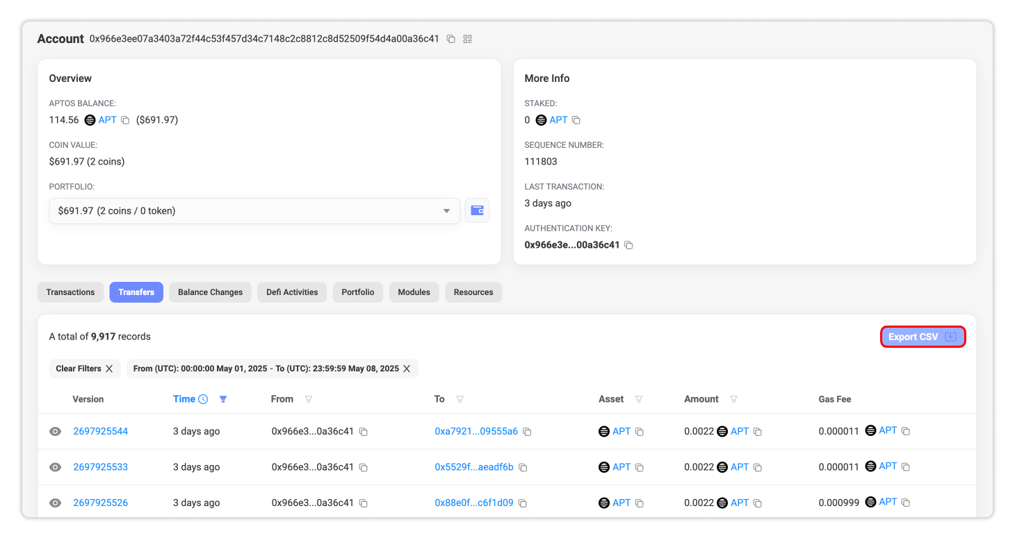 Keeping a clear record of your blockchain transactions can be essential, whether you’re filing taxes, preparing for an audit, or simply reviewing your trading activity. To make this easier, Aptoscan offers a CSV export feature that allows users to download their transaction history in a spreadsheet format.