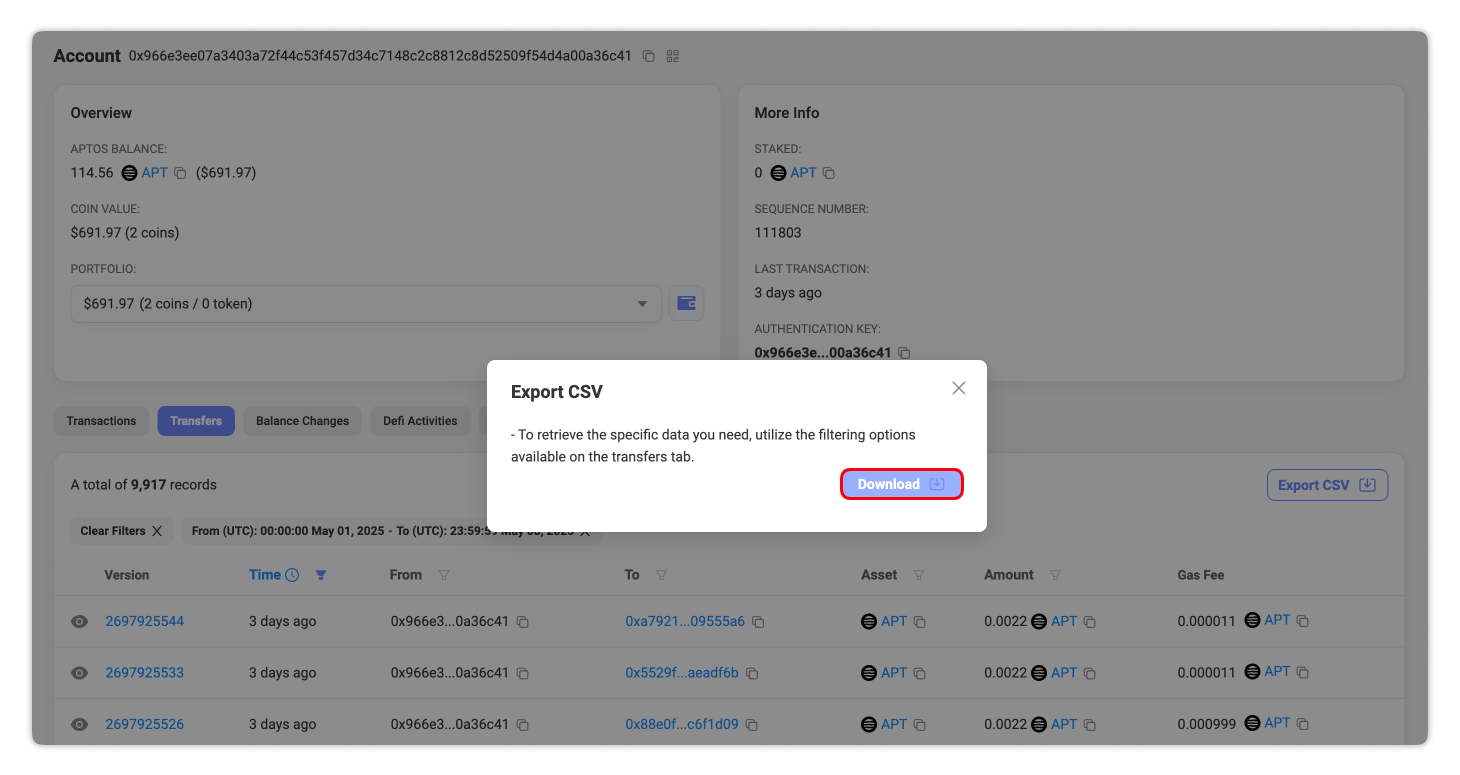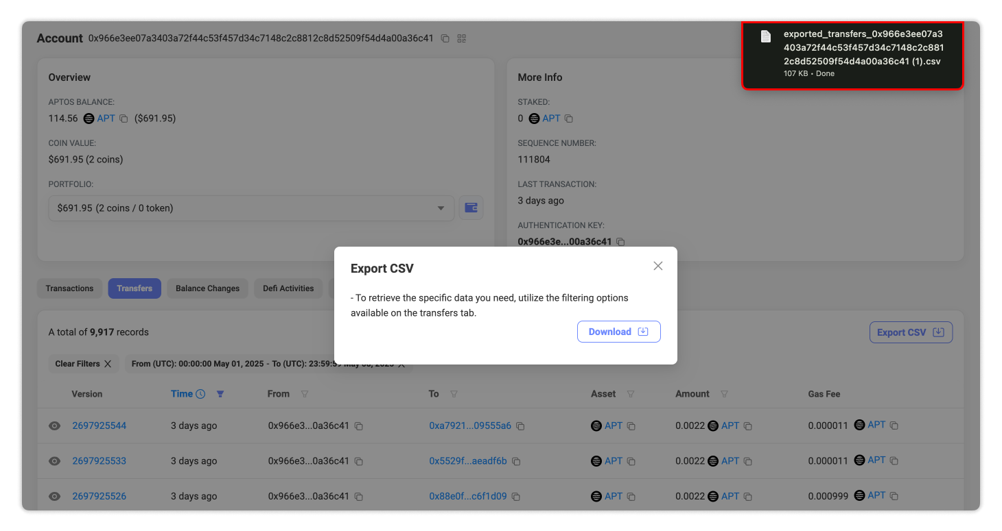 This file will provide a detailed record of your Aptos activity—ready for tax reporting, portfolio tracking, or any other purpose that requires clear documentation.
