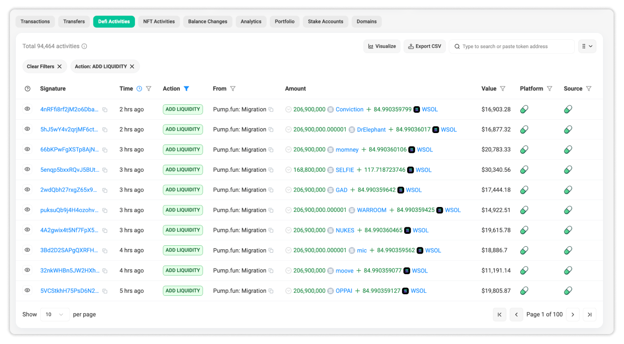 - activity_type: A variety of Defi activites data available on Solscan for Solana DEX.