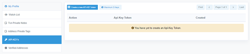 On the Etherscan user dashboard, you can select “API-KEYs” from the left-hand side column.