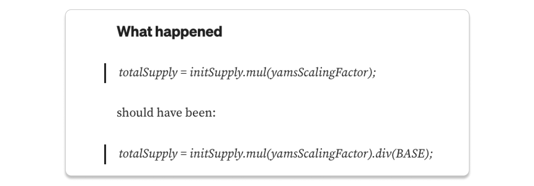 Yam Finance’s smart contract had a critical bug in its rebase function. The code mistakenly calculated the total supply without dividing by the constant BASE (10¹⁸), causing exponential over-minting of YAM tokens with each rebase event.