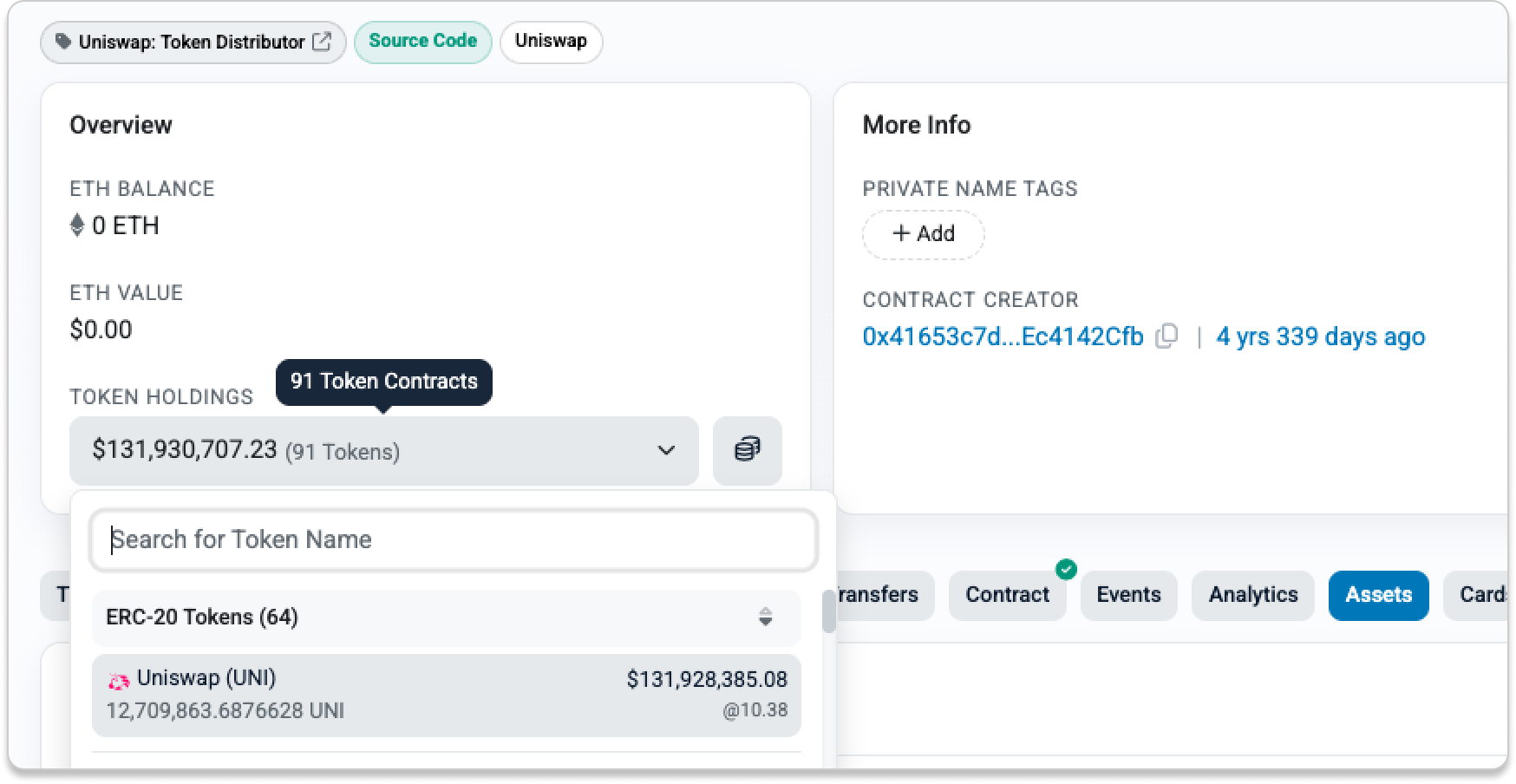 On Etherscan's token holder chart, the "Uniswap: Token Distributor" address shows a remaining balance of about 12,709,863 UNI, which is approximately 1.27% of the total 1 billion UNI supply.