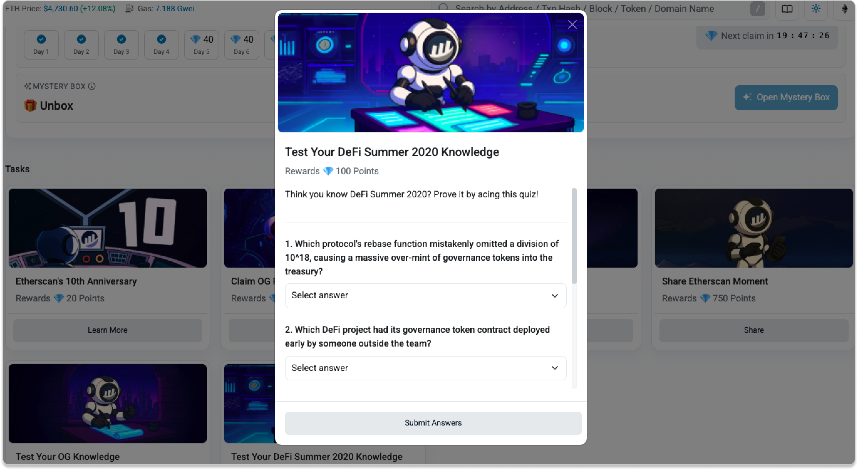 Here are the correct answers along with a bit of history behind each one. So whether you nailed them all or learned something new, you’ll walk away with a few more Ethereum trivia points (and hopefully some Etherscan Points too).