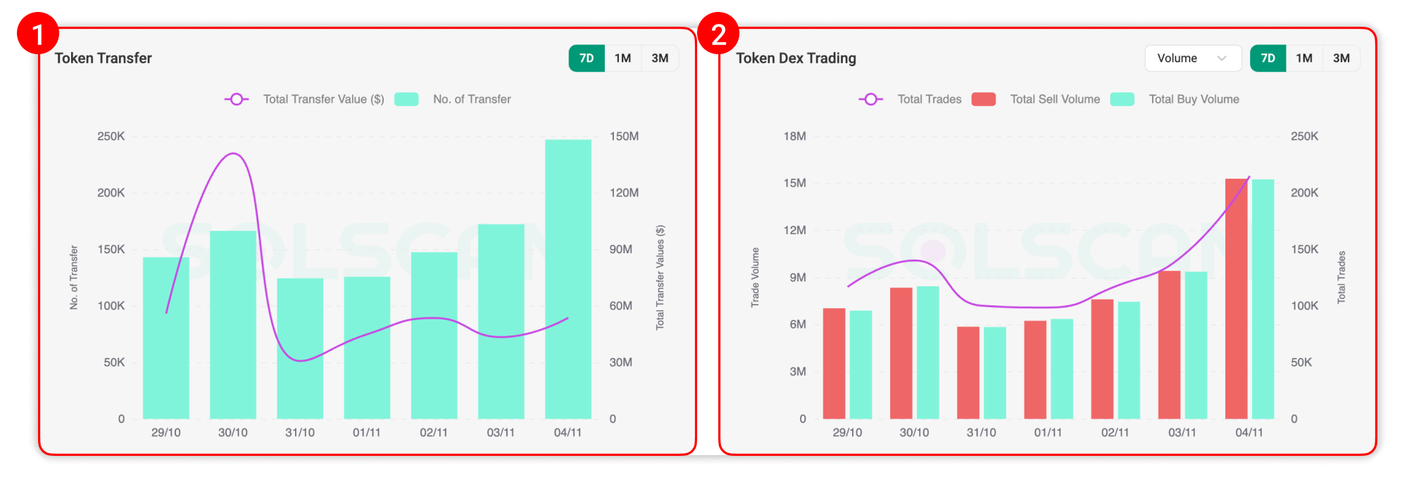 - Token Transfer: Displays the total value and count of the token’s movements between wallets (excluding trading pairs) over time.