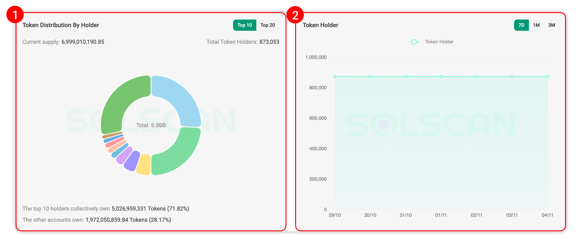 - Token Distribution by Holder: Displays the distribution of token holdings across wallets.
