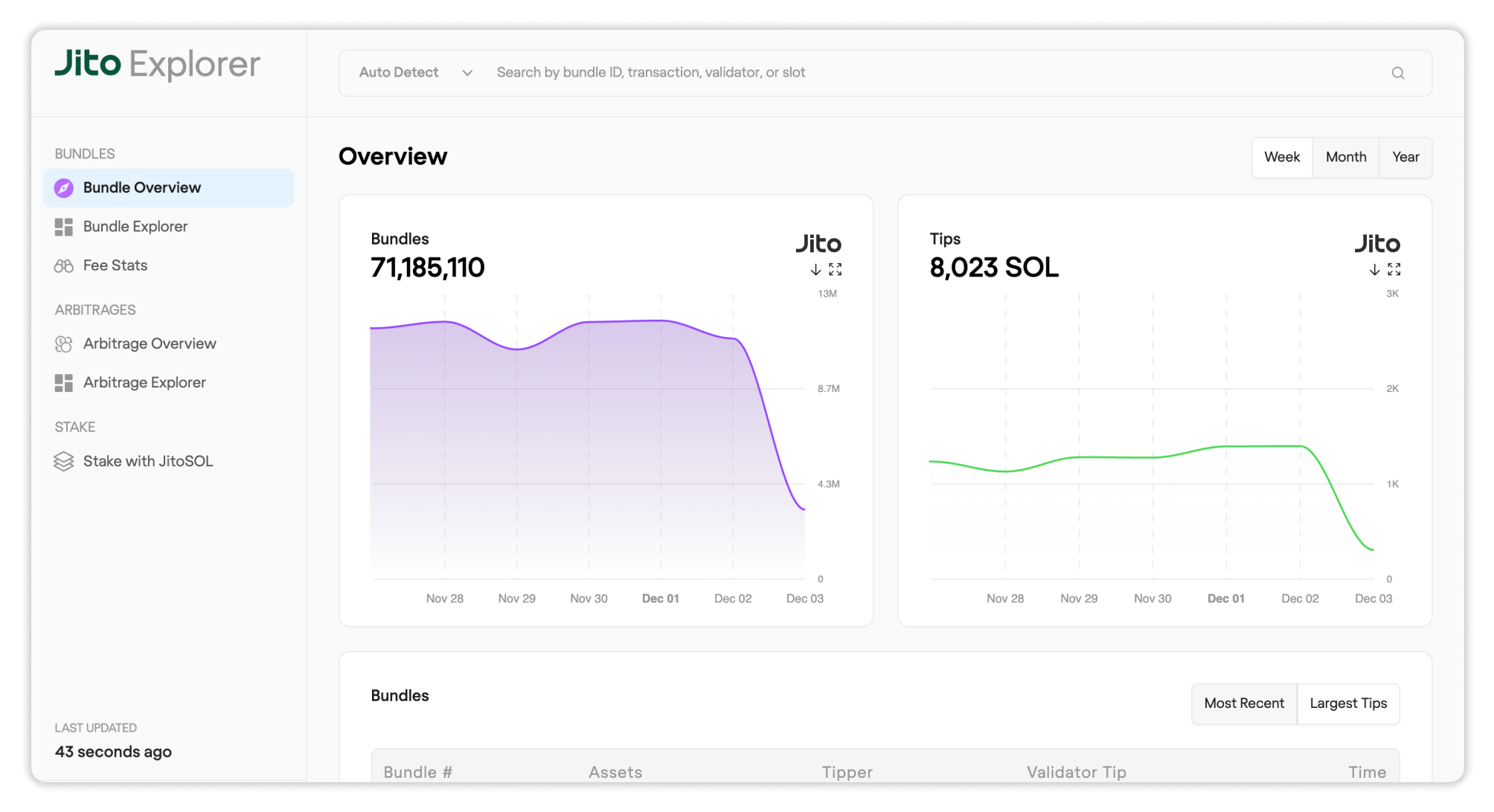 Focused on the Jito ecosystem, this explorer surfaces MEV-related data including bundles, searcher transactions, tip flows and validator participation. It is designed for users examining MEV behaviour rather than general on-chain activity.
