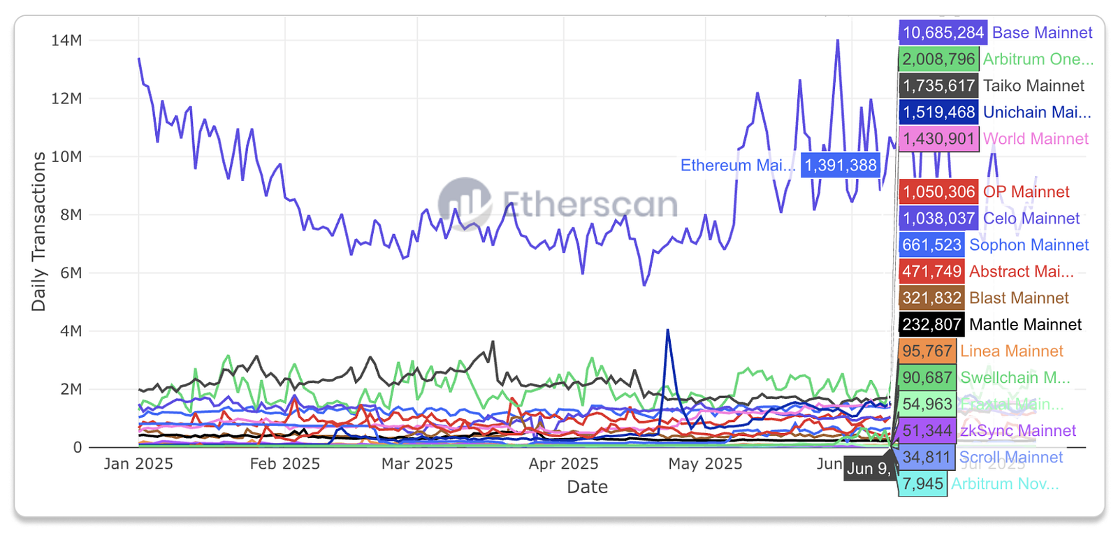 Ethereum’s second layers (L2s) represent a large and still growing ecosystem allowing cheaper, faster transactions — running on rails tuned by Dencun, Pectra and other upgrades. L2s have seen rapid rise in usage in the past year. Coinbase’s Base L2, for example, now processes 10 times as many daily transactions as L1 itself.