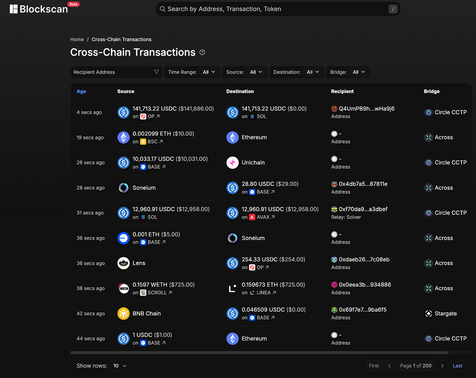 One thing you can do with Blockscan as well is filter cross-chain transactions by a target wallet to inspect their activity. You can use Etherscan’s API to get the most frequent bridging wallets, then narrow the Blockscan table to these and inspect their usage. V2 API also introduces a new endpoint that lists all bridge transactions for any address, which could easily extend this analysis.