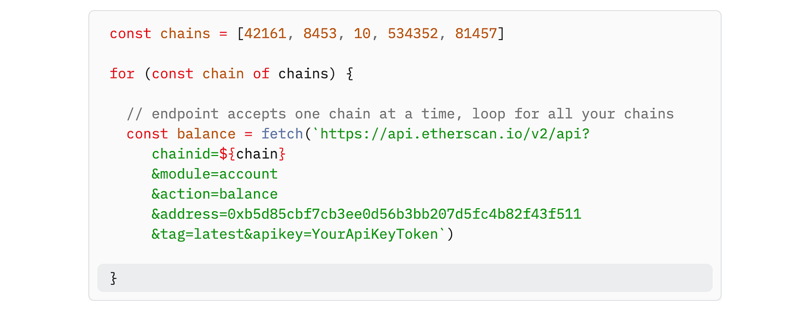 For example, we can use the V2 API to get the balance of an address across several chains. Simply specify the chainid in the API call, and you can extract information about addresses with the same API usage across many supported chains. You can also do this with contracts, transactions and more.