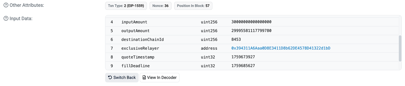 I chose the transaction type depositV3 (one of Across’s main contract calls) which has a parameter called destinationChainId telling us where the ETH or ERC-20 token is going. It’s neat to see the transactions encoding their ultimate destinations: Arbitrum, Base, BNB Smart Chain, Optimism, and more.