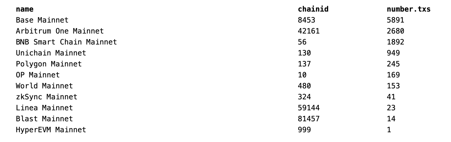 The same can be said for Base: The most active contract in the data sampled here is Uniswap’s V4 as well, with well over 1,000 transactions of recent Across bridgers flowing into the router.