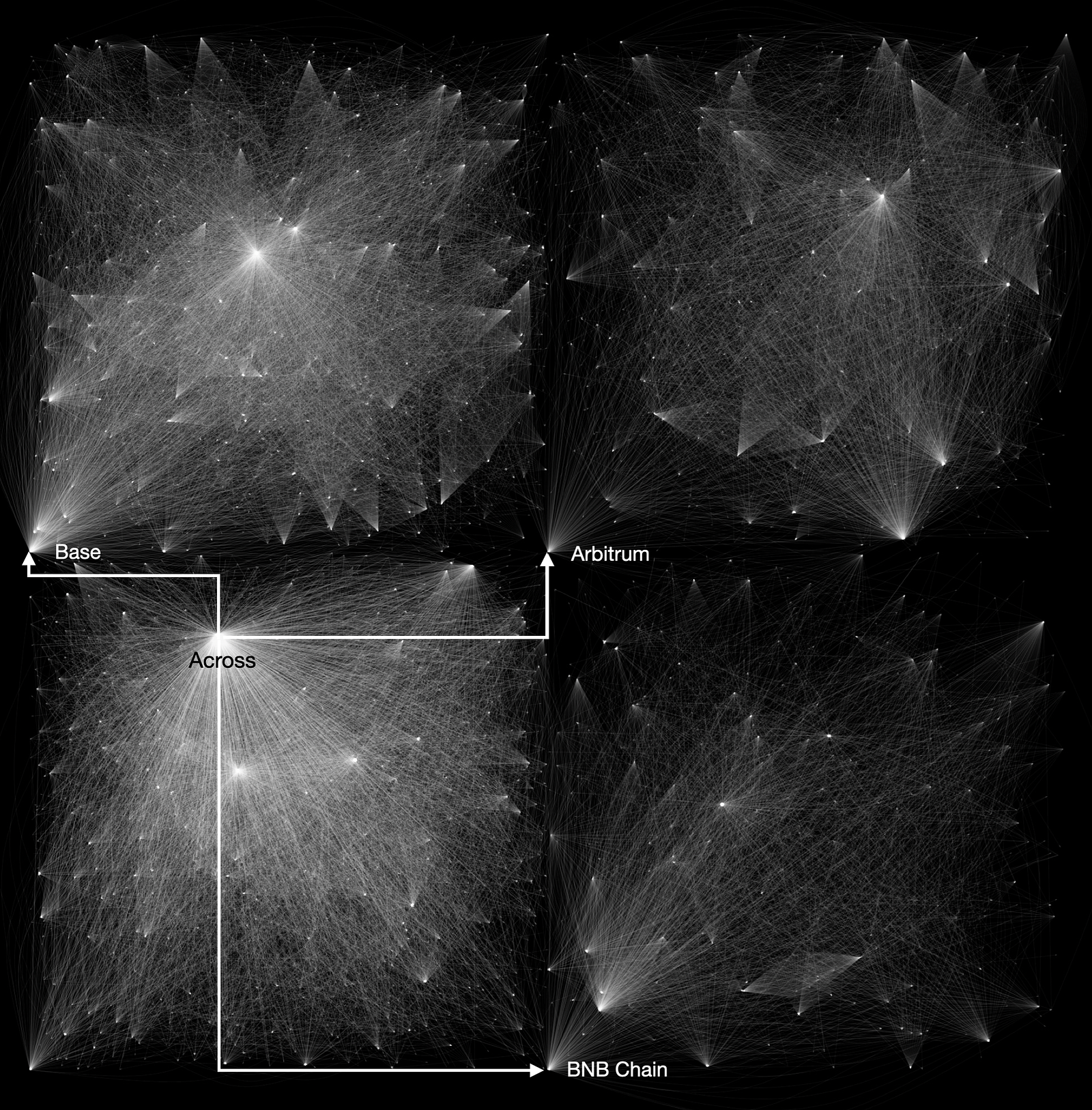 I chose three chains that got the most activity from Across Protocol: Base, Arbitrum, and BNB Chain. These are represented below as separate systems with their own transactions. The bright spots are the most frequently used addresses or contracts in this data snapshot.