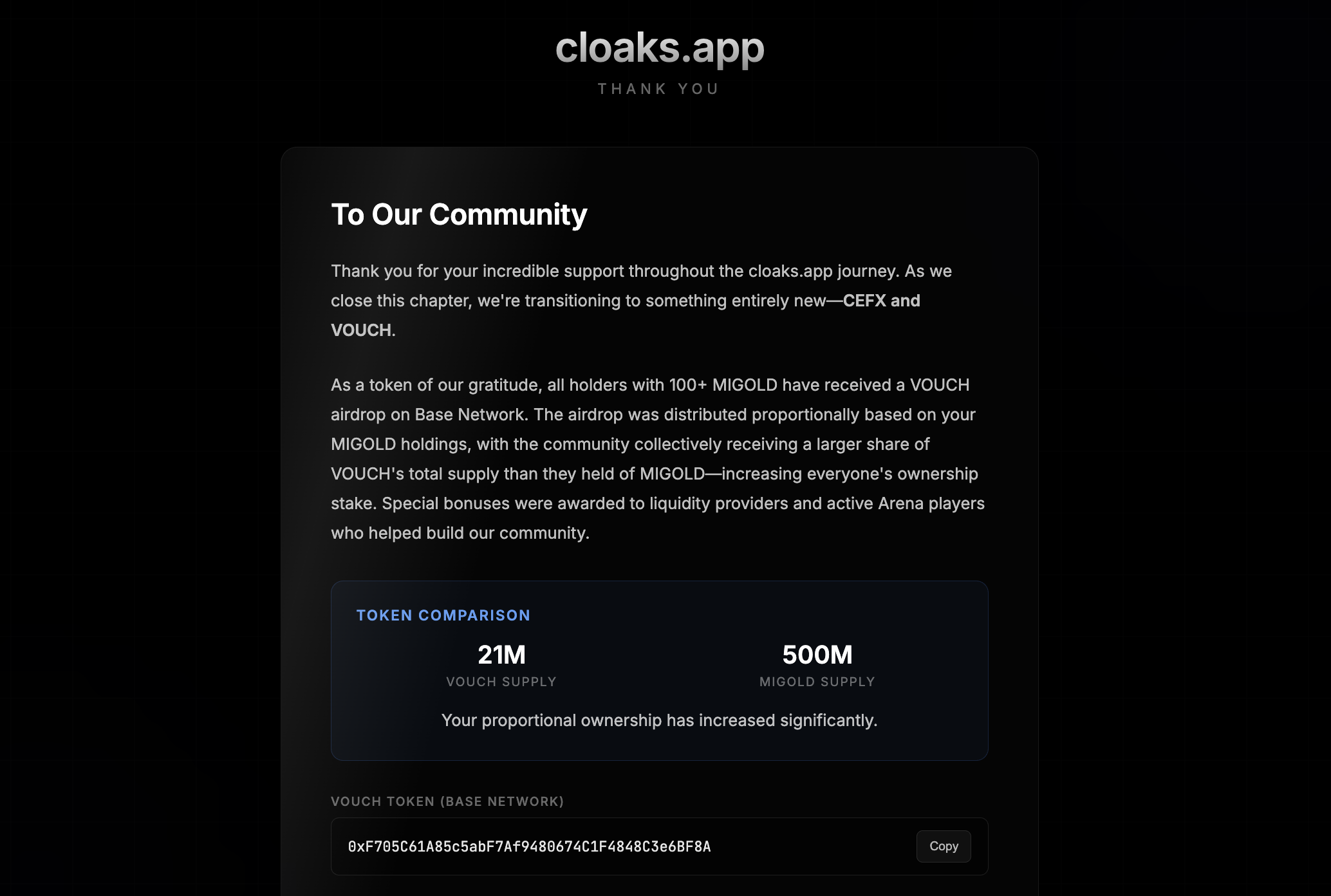 Coincidentally, soon after discovering this interesting onchain activity, the CLOAKs app completely closed operations. All that's left is a website with a brief note and a voucher contract on Base: