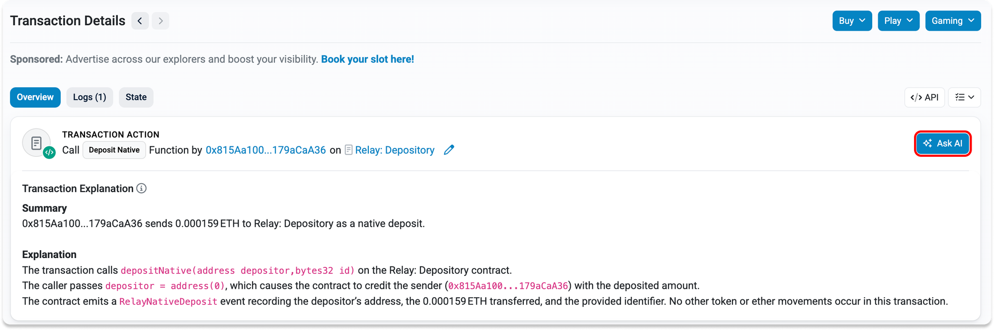 Turning on this option adds an "Ask AI" button to transactions that do not have curated transaction actions yet. Tap it for an AI-generated summary of the transaction.