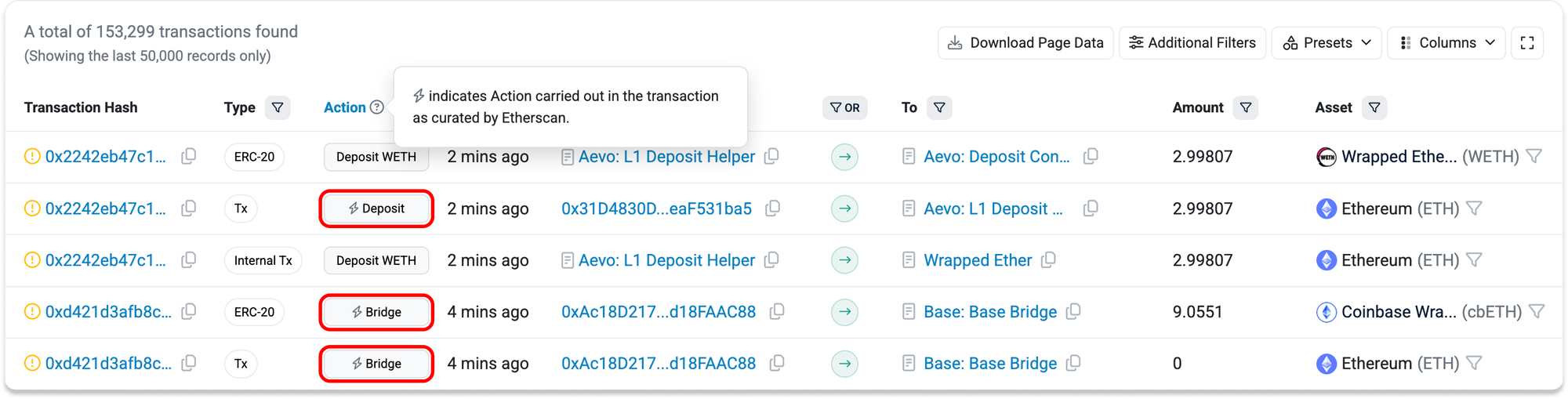 Display curated ⚡ Actions like Bridge or Deposit for each transaction instead of the default function names.